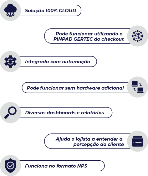 Nossa plataforma de pesquisa rápida, o MyNPS, possibilita ao lojista coletar e entender o nível de satisfação do seu cliente, como também o seu NPS (Net Promoter Score) de forma prática e ágil. Inclusive, utilizando o PIN Pad Gertec PPC930 (utilizado no checkout para pagamentos) também para a coleta dos dados da pesquisa.
